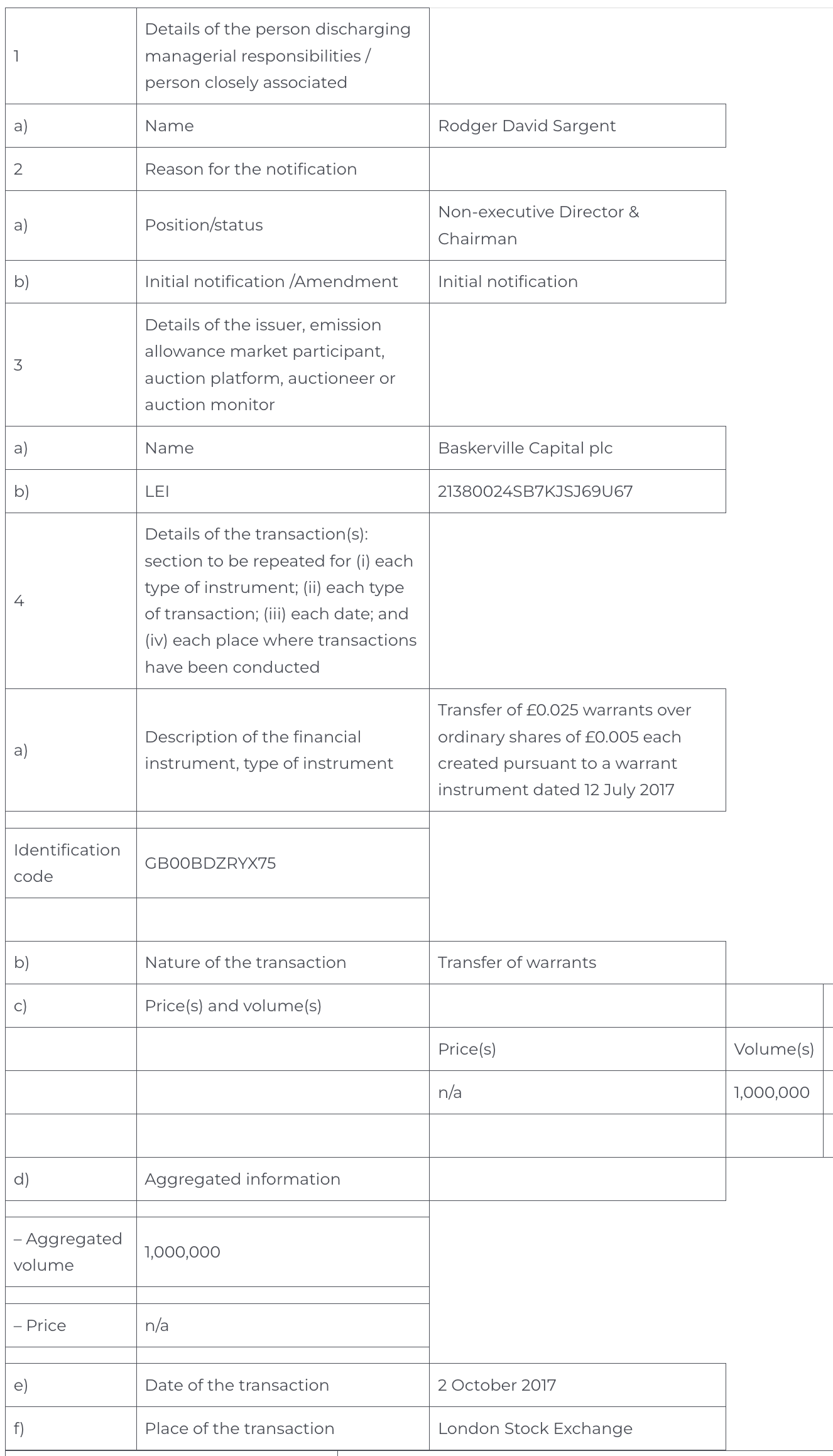 Baskerville Capital PLC (LSE: BASK), a newly established company formed to acquire a company or business with a technology focus, announces that 1,000,000 warrants over ordinary shares of £0.005, with an exercise price of £0.025, have been transferred from Christopher Akers, Founder, to Rodger Sargent, Non-executive Director & Chairman, at no cost.