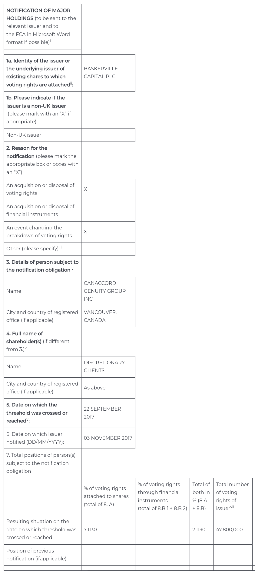 Baskerville Cap PLC – Holding(s) in Company