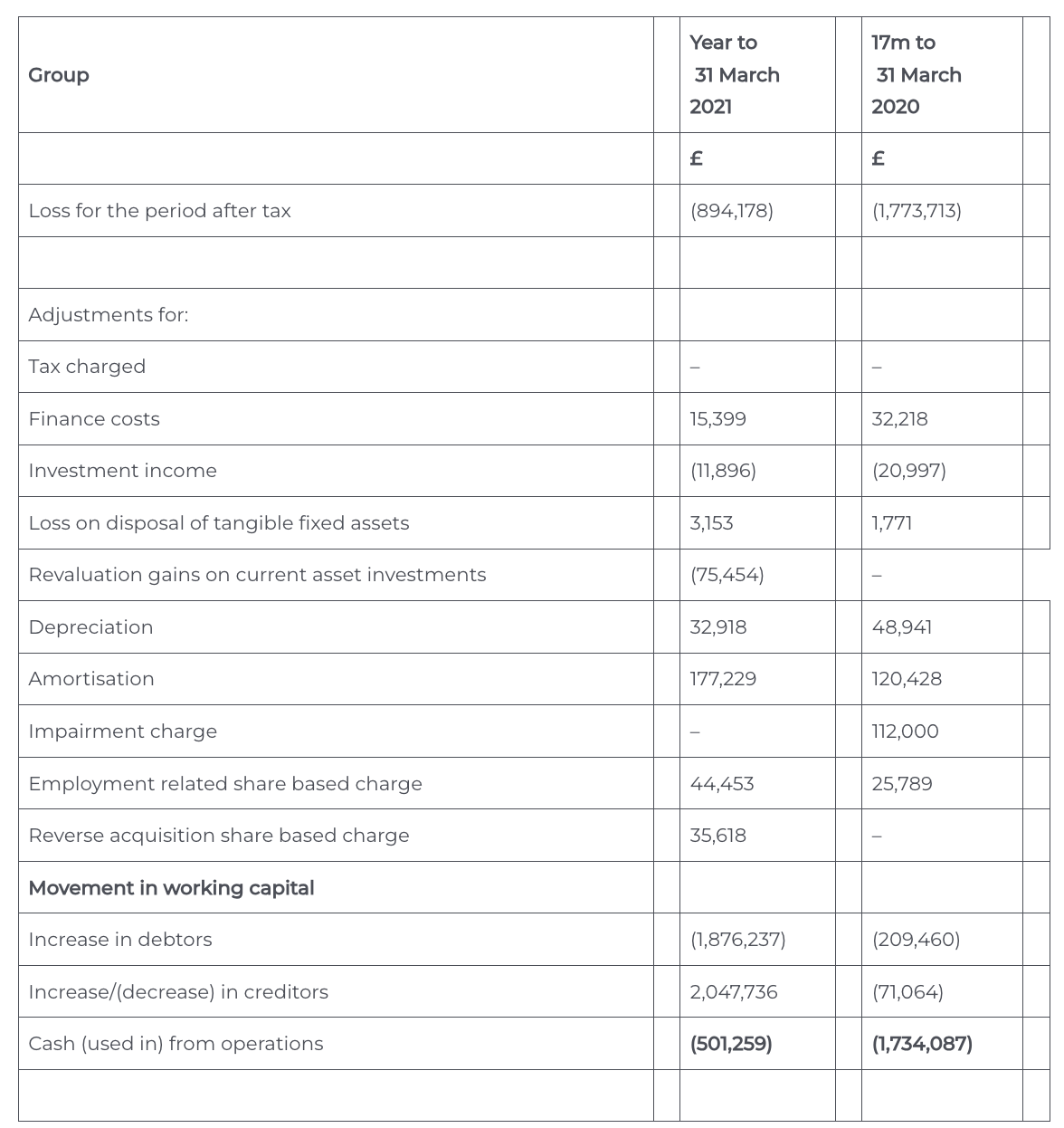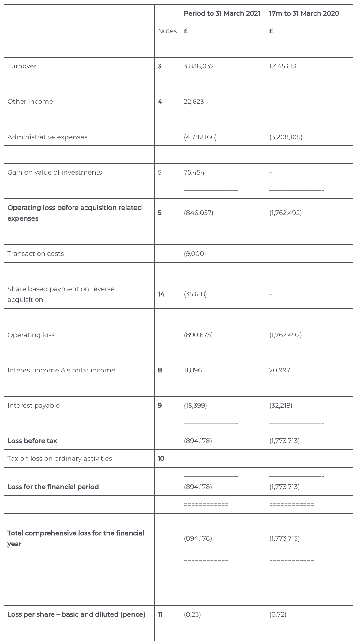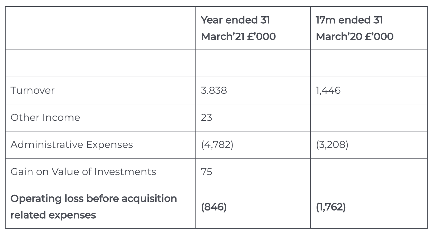 Because of the increase in costs associated with the investments mentioned above, the business made an operating loss before acquisition related expenses of £846,057 in the year to 31 March 2021 compared to a loss of £1,762,492 in the 17 month period to 31 March 2020.