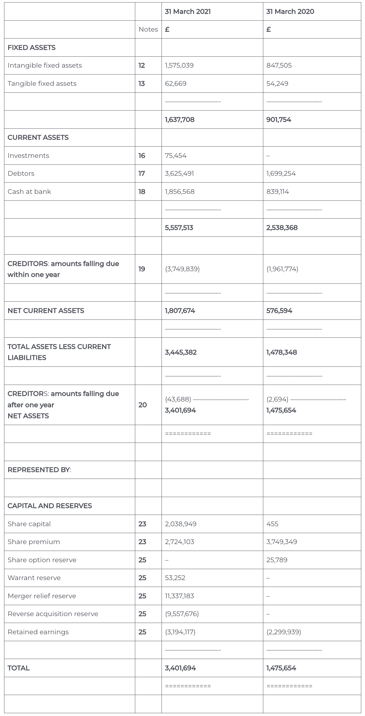 - Strong cash position £1.9m (2020: £0.8m) and balance sheet at year end