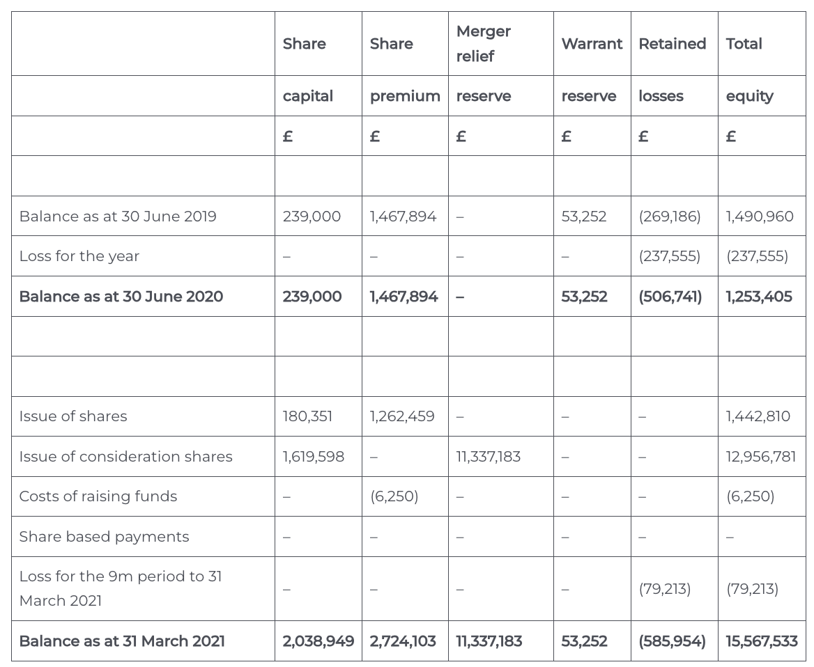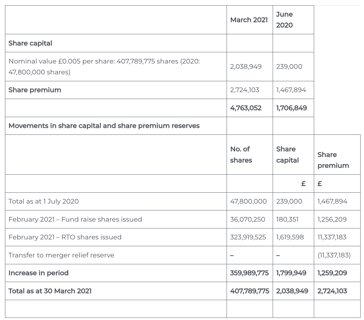 On 9 February 2021, the Company acquired the remaining 91.13% of the issued share capital of Oberon Securities Limited (‘legal subsidiary’) which it did not already own, for a consideration of £12,956,781 by the issue of 323,919,525 shares. As the Company acquired more than 90% of the shares in Oberon Securities Limited, Section 612 of the Companies Act 2006 applies, and accordingly the Company set up a Merger Relief Reserve on the issue of these shares. As the legal subsidiary is reversed into the Company (‘legal parent’), which originally was a publicly listed cash shell company, this transaction cannot be considered a business combination, as the legal parent does not meet the definition of a business. As the transaction is capital in nature and completed through the issue of shares it falls within the scope of Section 26 of FRS 102 “Share Based Payments”. Any difference in the fair value of shares deemed to be issued by the legal subsidiary and the fair value of the net assets in the legal parent will form part of the deemed cost of acquisition.