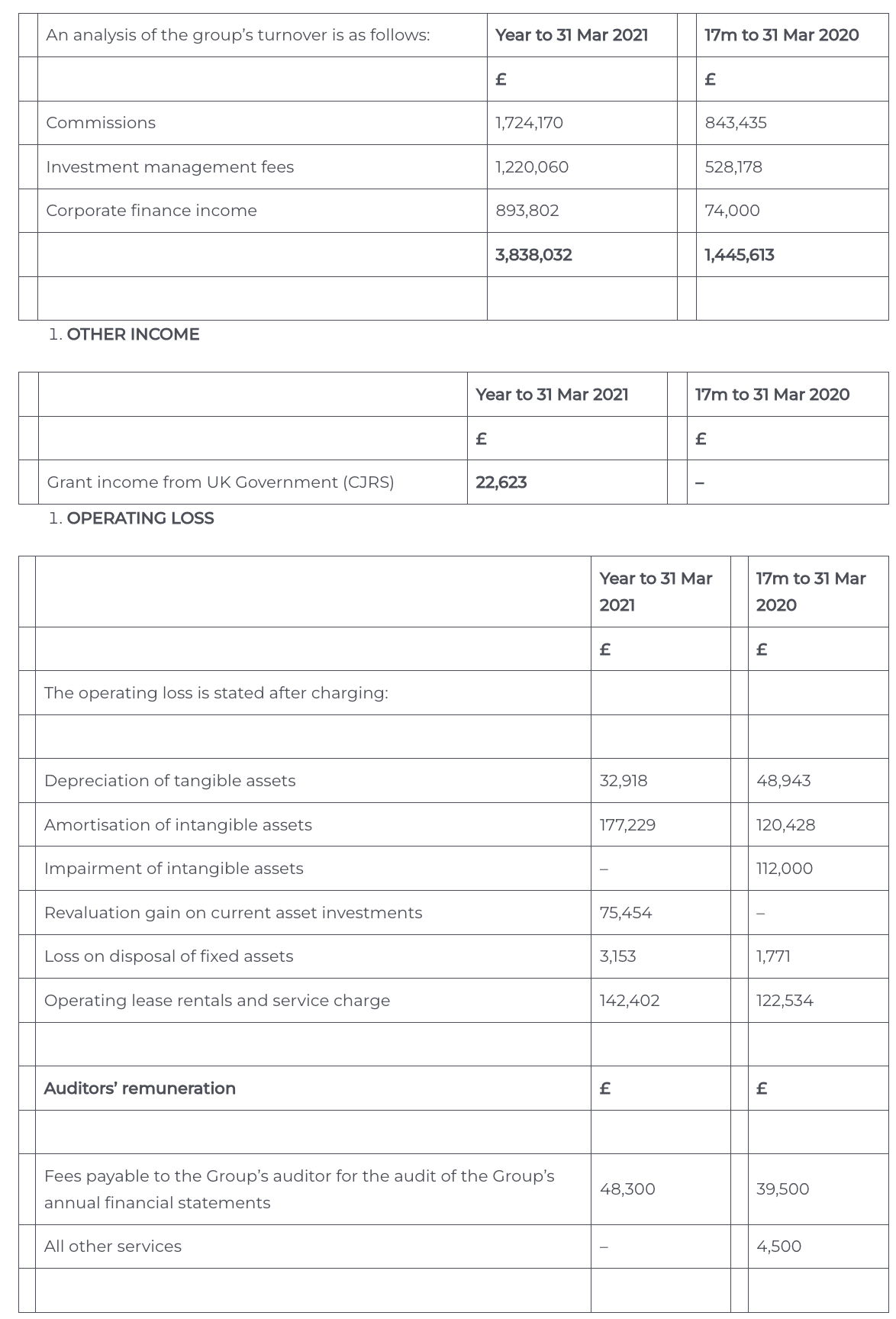 On a reported basis, as per the Consolidated Statement of Comprehensive Income, revenue grew by 167% from £1,446k (which was a 17 month period) to £3,861k. This increase in revenues has been generated both through the development of our new corporate finance division (Oberon Capital) as well as strong growth in our fund management business which has seen AUA grow from circa £126m at 31 March 2020 to over £550m at the 31 March 2021. Although a lot of this work has been completed, there are still further opportunities to invest to grow the business both organically and through acquisition.