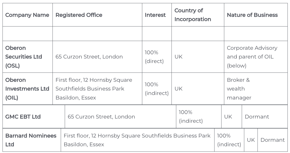 The following were subsidiary undertakings of Oberon Investments Group plc: