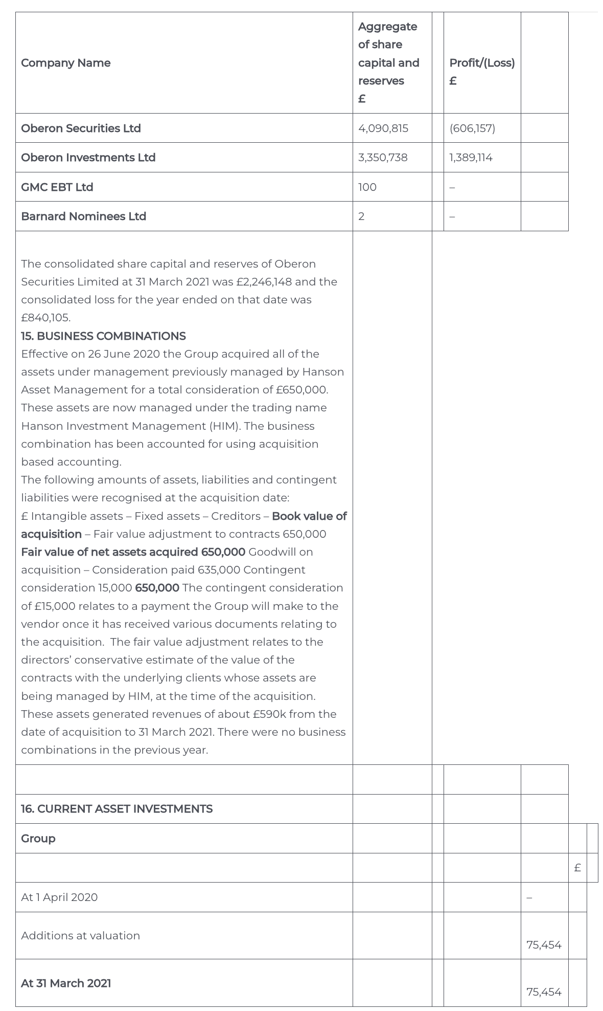 The results shown above for the year to 31 March 2021 reflect the consolidated results in the year for Oberon Securities Limited combined with, from 9 February 2021 to 31 March 2021, the results of Oberon Investments Group plc (previously Baskerville Capital plc) – which was the remaining period in the financial year following the completion of the RTO. The financial year end of Oberon Investments Group plc was changed from June to March in order to bring it in line with the financial year end of the rest of the Oberon group. The figures shown for the comparative period reflect the consolidated results of Oberon Securities Limited (as previously published) for the 17 month period to 31 March 2020.