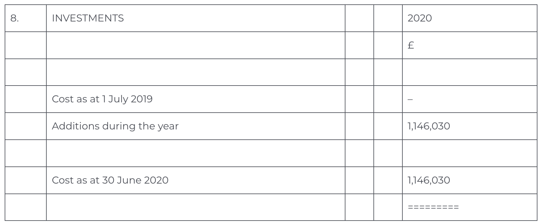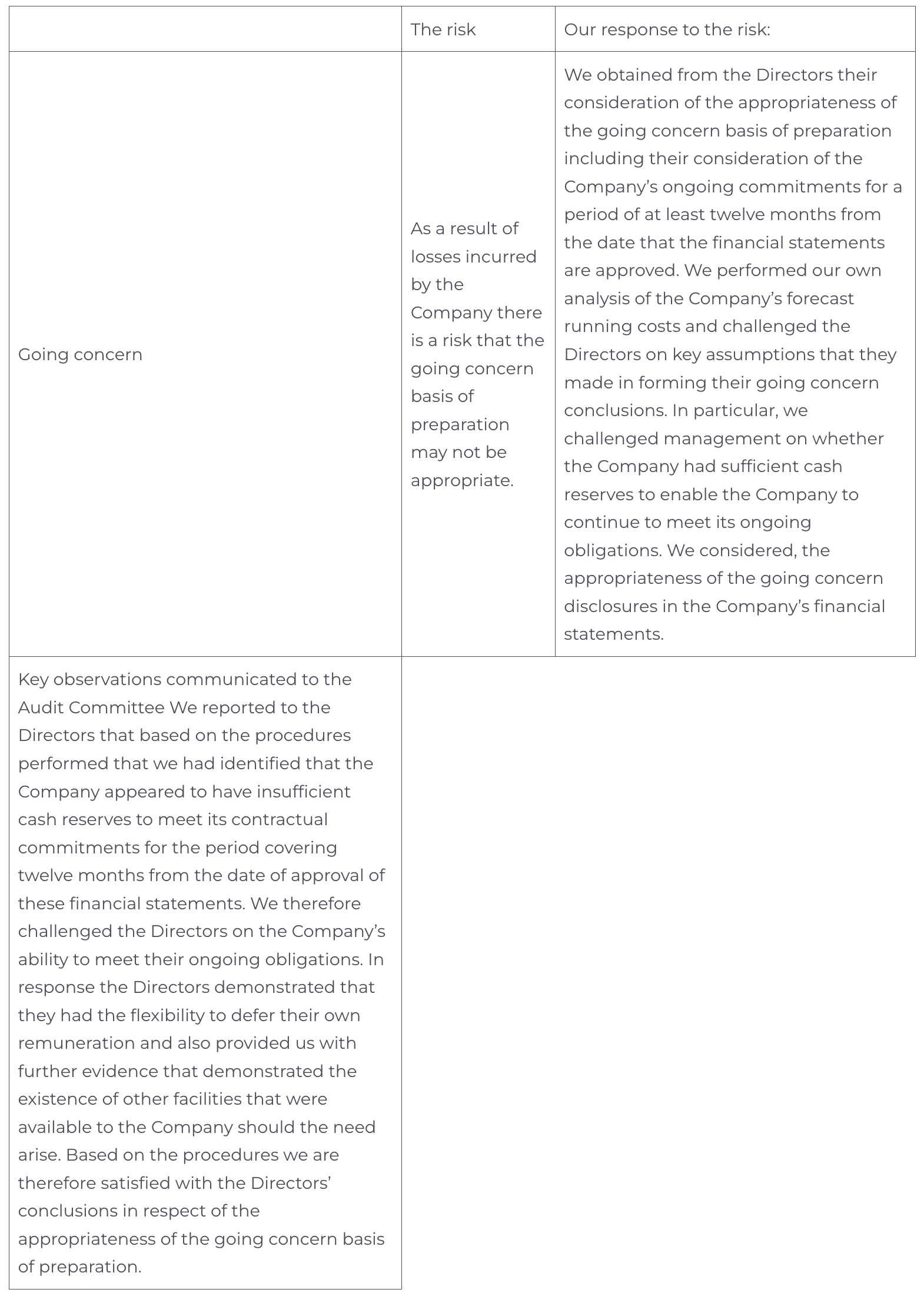 As described in note 2 to the financial statements, fixed asset investments are initially recorded at cost, and subsequently measured at fair value through profit or loss. Significant judgement is required in assessing the fair value of investments. However, the Directors’ have assessed that, as the investment was made during the year and that there has been no material changes in the Company’s activities or performance subsequent to the acquisition date that the acquisition price continues to be reflective of the fair value of the investment as at the year-end date. Accordingly, the investment continues to be held at cost.