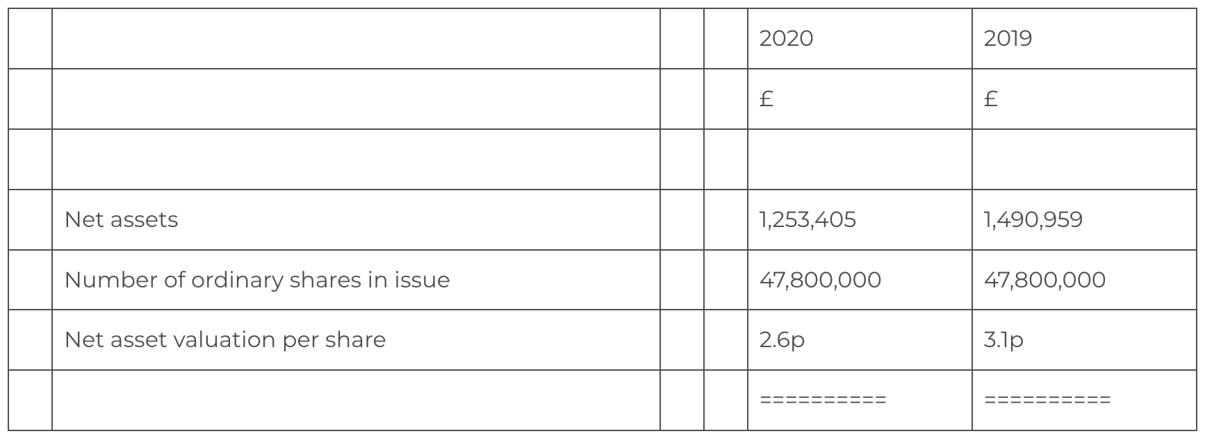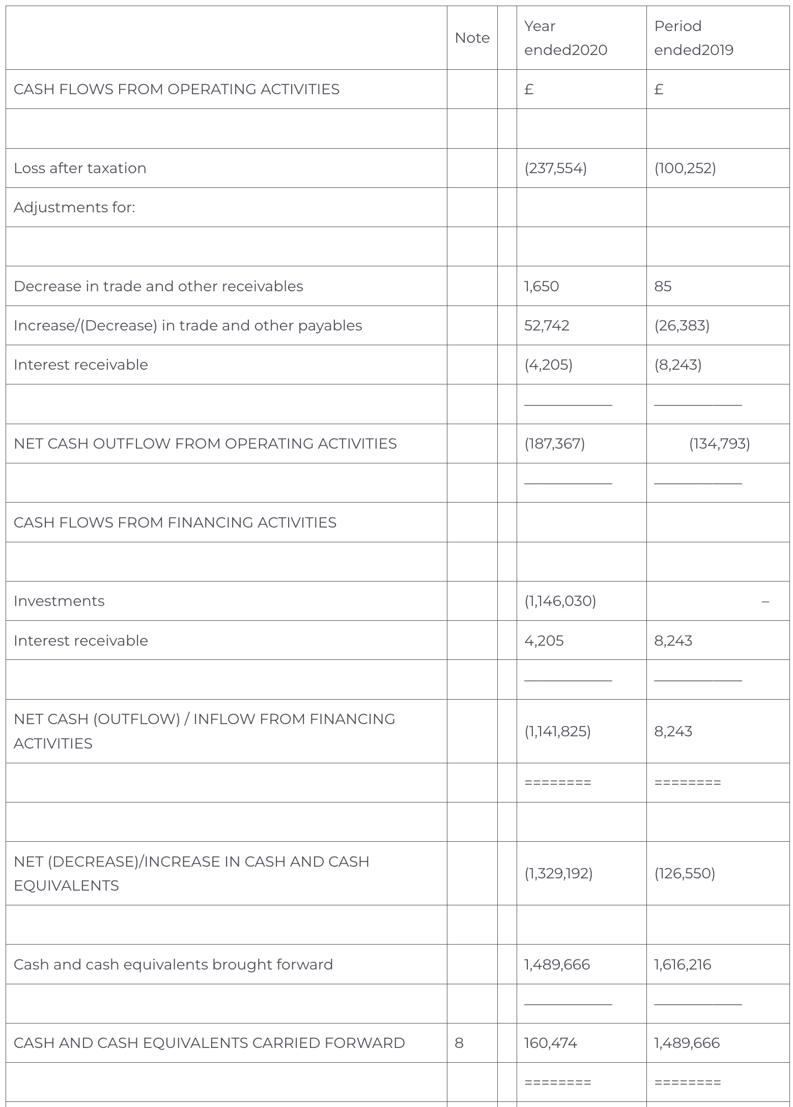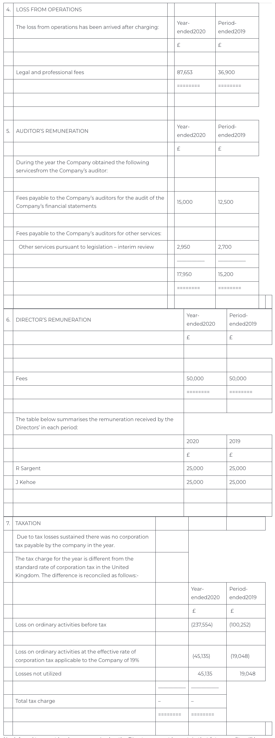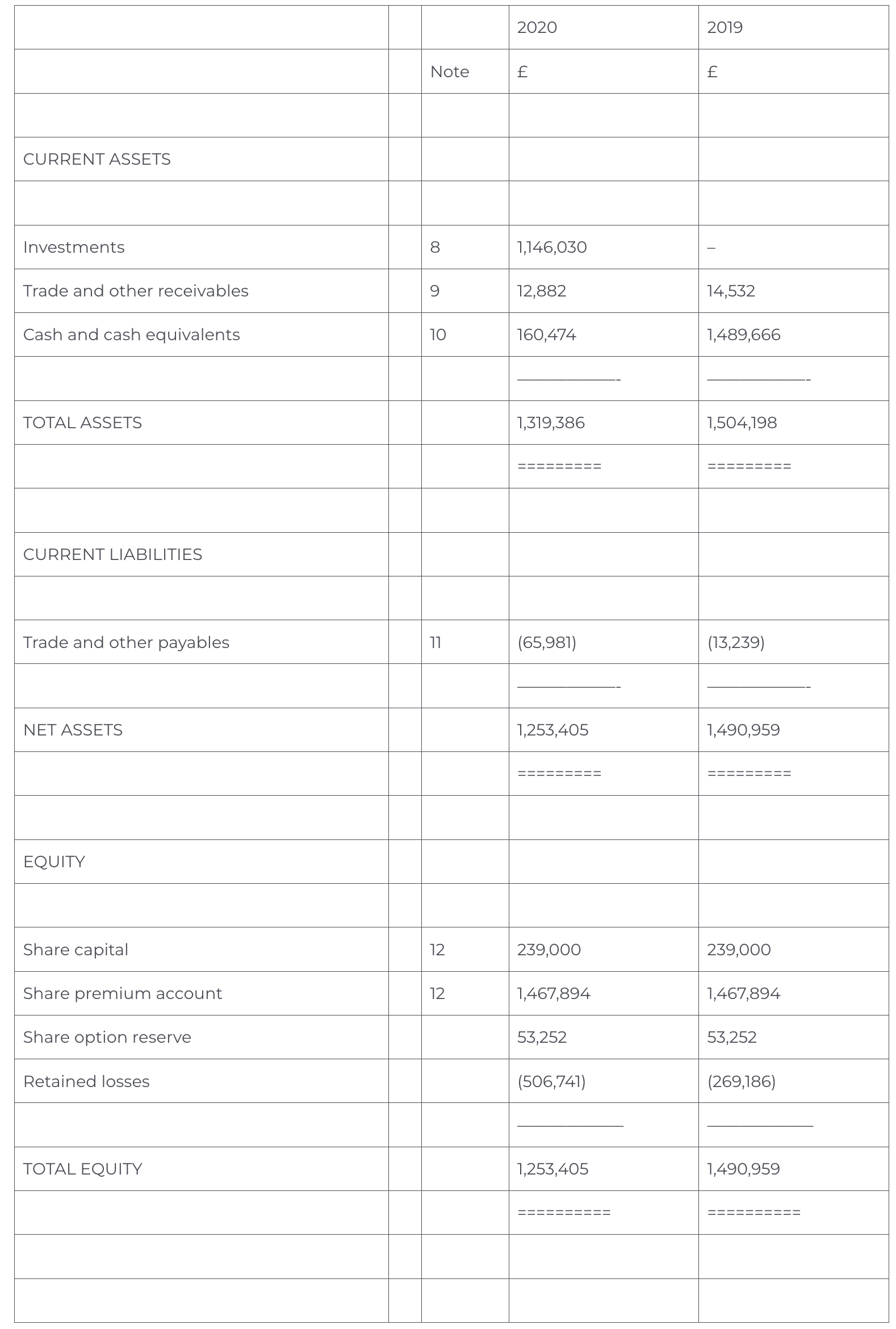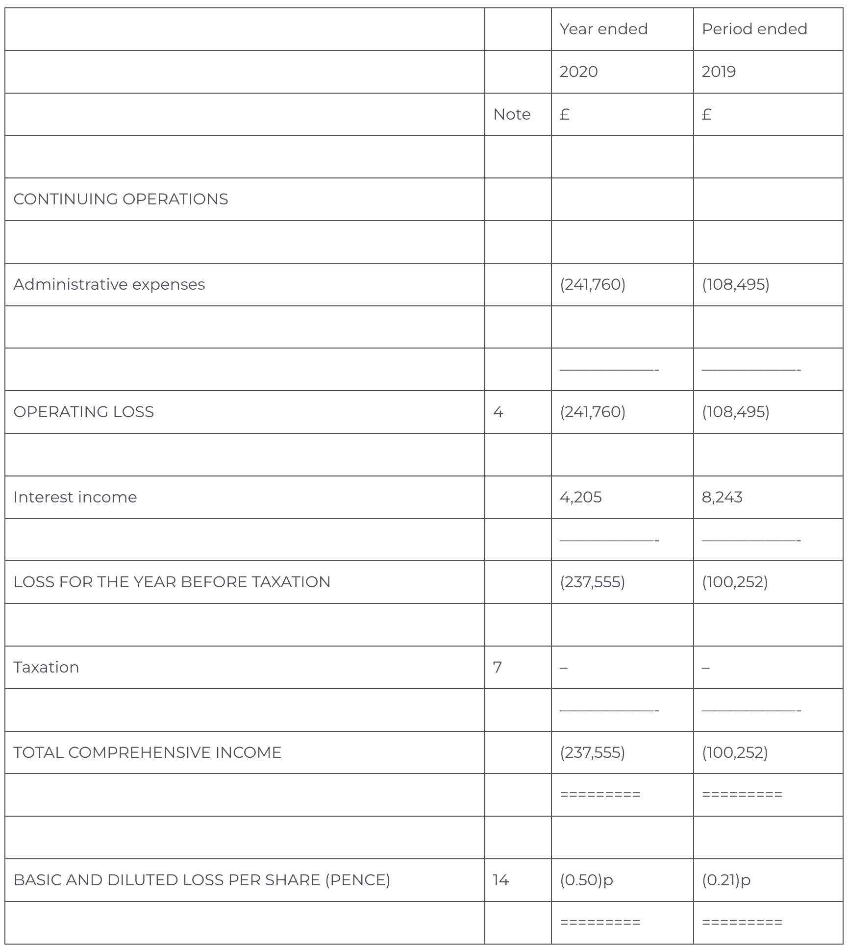 - Loss of £237,554 (2019: £100,252) reflecting the ongoing administration costs of being a cash shell listed on the London Stock Exchange and professional fees incurred prior to year end regarding the proposed acquisition of Oberon Investments Limited (‘Oberon’)