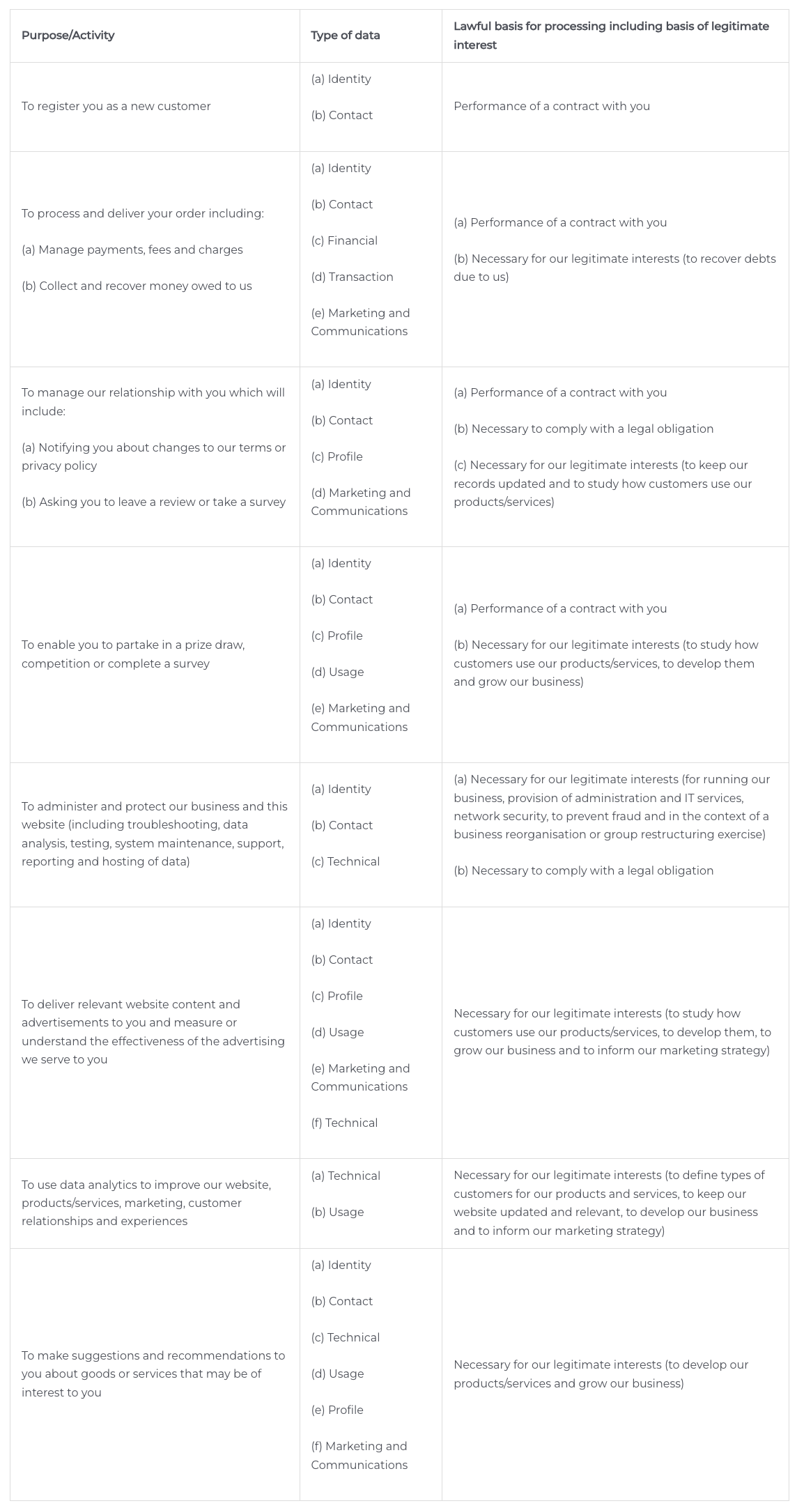 We have set out below, in a table format, a description of all the ways we plan to use your personal data, and which of the legal bases we rely on to do so. We have also identified what our legitimate interests are where appropriate.